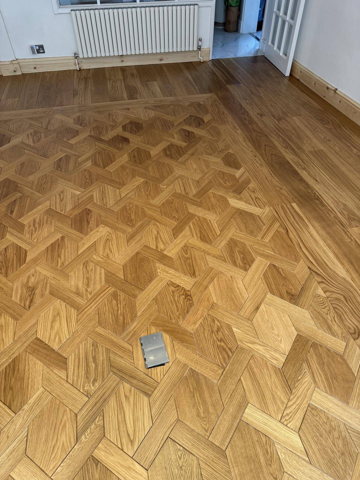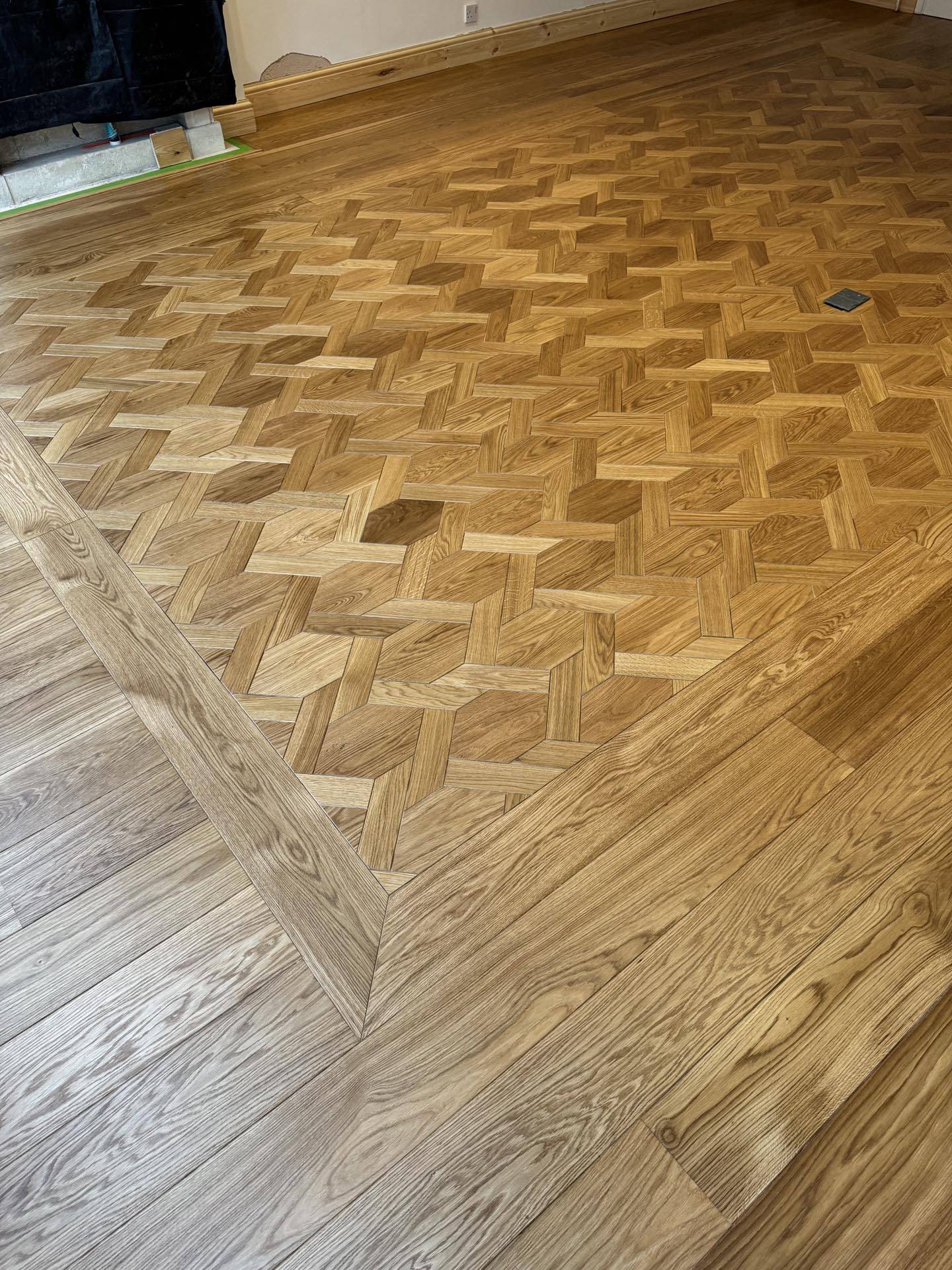 We removed the existing wood flooring and substrate, we then Installed a new substrate and installed insulation below the joists, we then planned out our wood flooring with the mansion weave installed as a centre master pieces and planks to border the mansion weave. We finished the flooring in a clear semi satin hard wax oil to provide depth and protection. Individually produced by Woodcraft Flooring for period and contemporary properties across the South East, delivering a balance of elegance, longevity, and technical excellence.