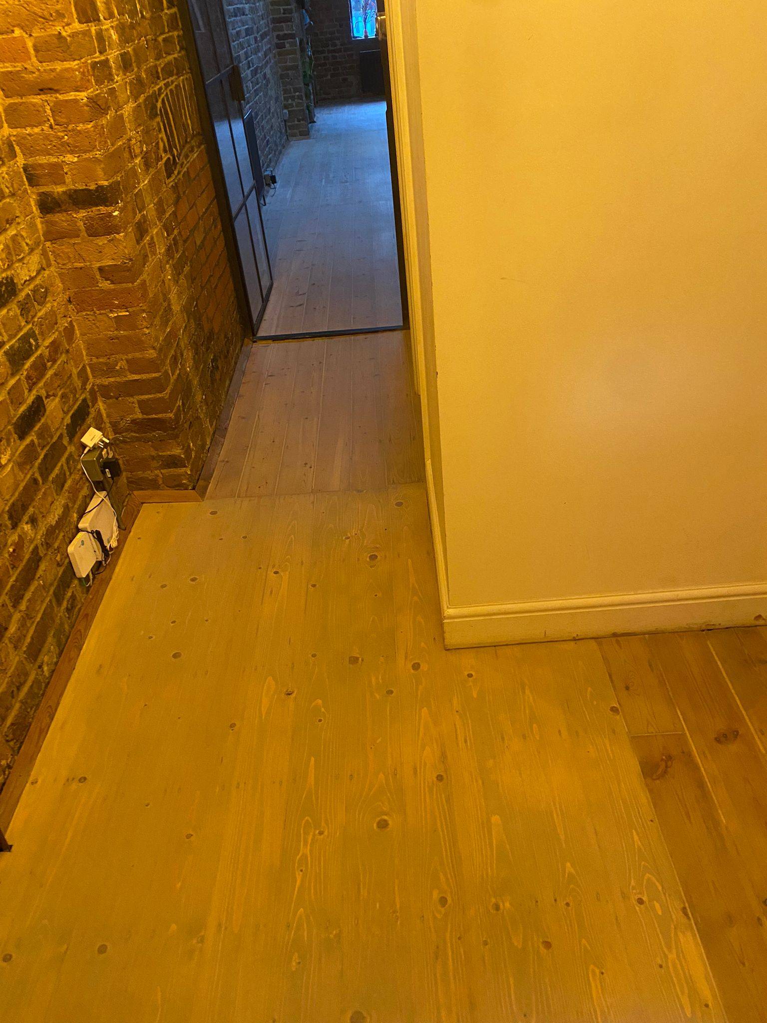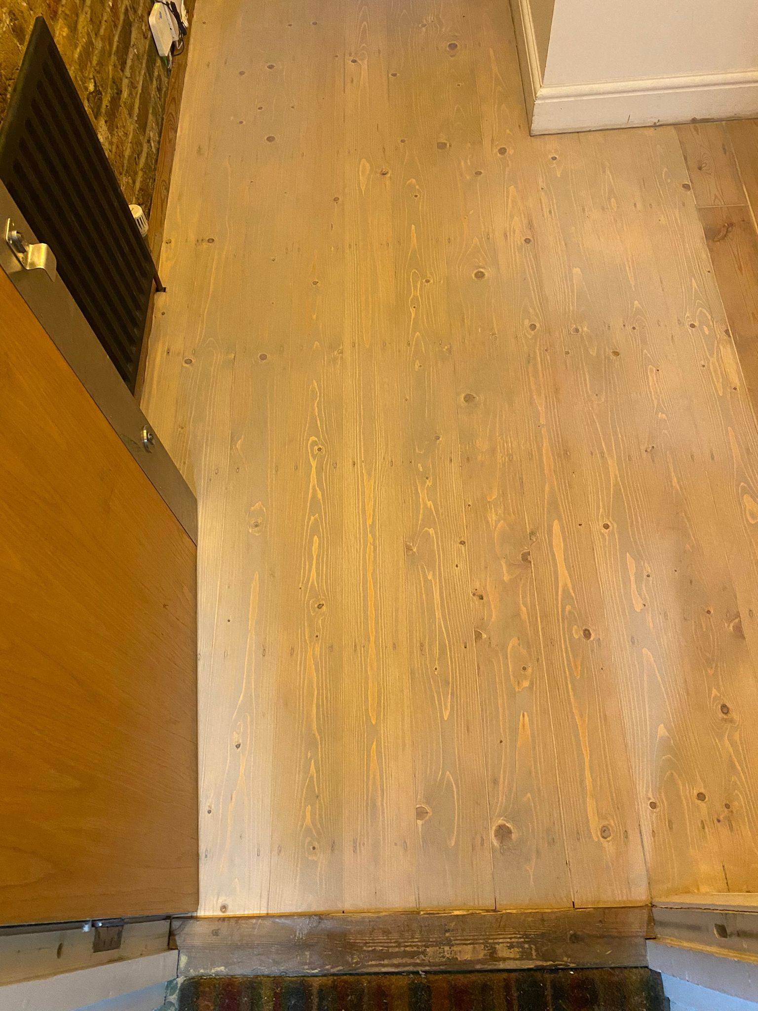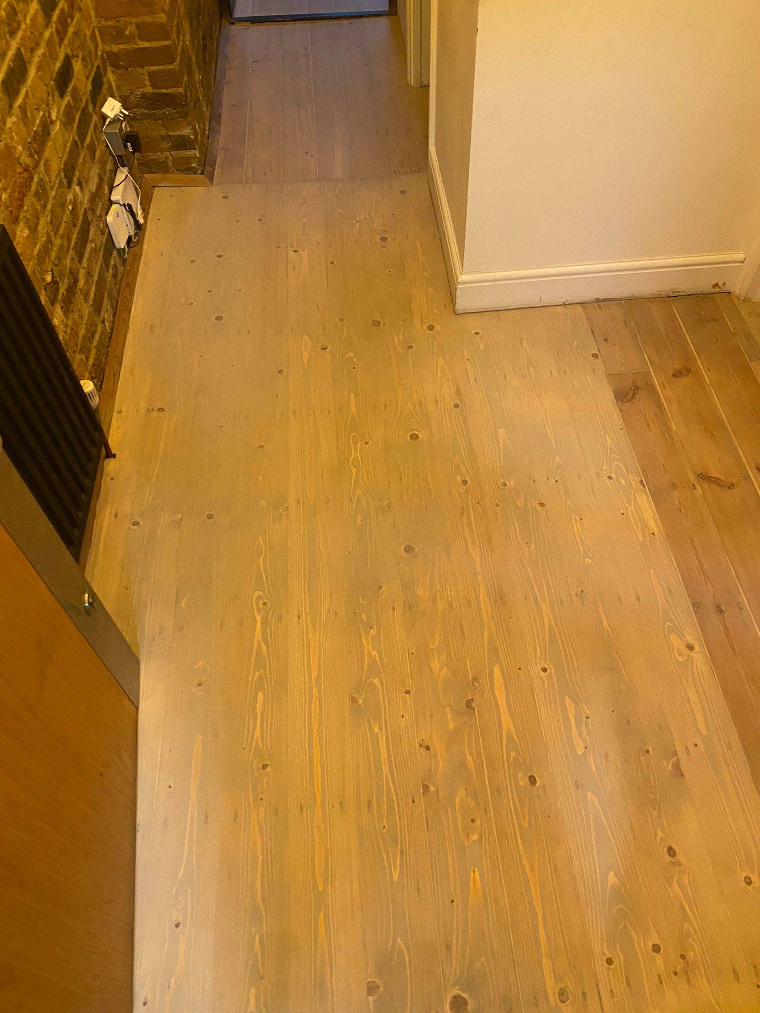 The result is a stunning, restored floor that combines the charm of the original pine boards with modern efficiency and style. This Shoreditch apartment now boasts beautifully finished floors that are as functional as they are aesthetically pleasing.